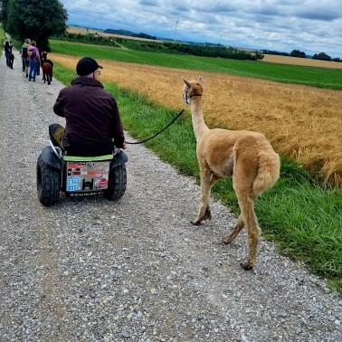 Gemeinsam machen Sie sich in einer kleinen Gruppe auf den Weg durch die wunderschöne Umgebung von Sigmertshausen – begleitet von einem Alpaka an Ihrer Seite.
